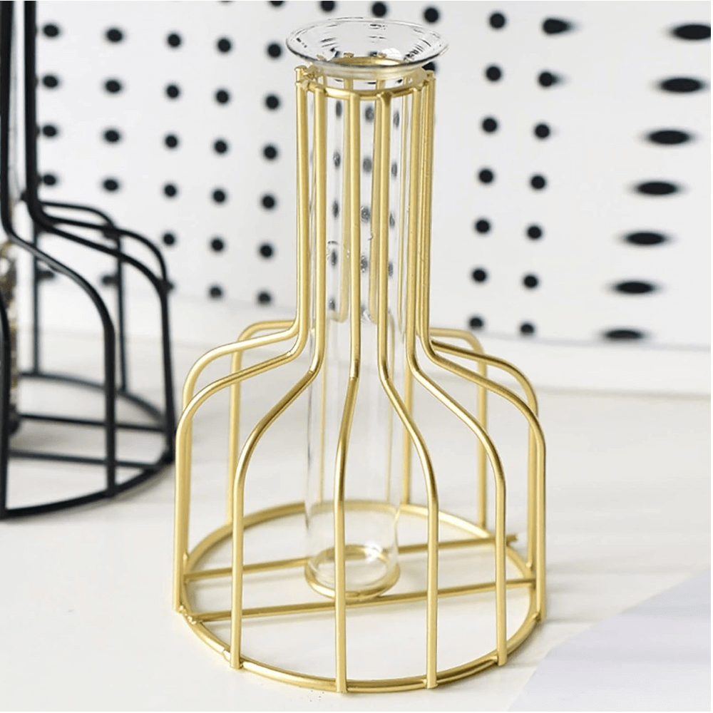 El florero está fabricado con estructura de hierro pintado en tono dorado metálico y un tubo de vidrio desmontable para colocar las flores.