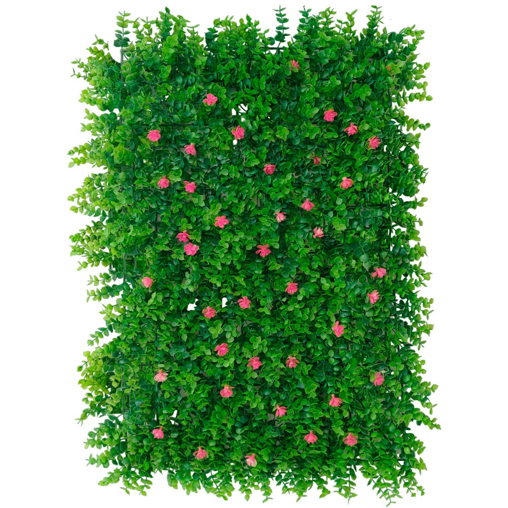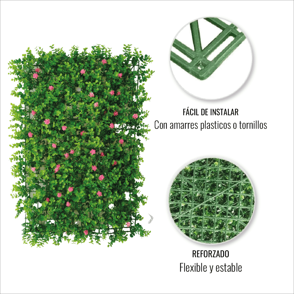 Es un panel decorativo fabricado en plástico de alta calidad que recrea el aspecto de un jardín natural con hojas verdes y pequeñas flores rosadas. Está diseñado para embellecer cualquier superficie de forma rápida, sin necesidad de riego, poda o cuidados constantes. Gracias a su estructura flexible de 40 x 60 cm, se adapta fácilmente a muros, techos o estructuras usando tornillos, amarres plásticos o silicona.