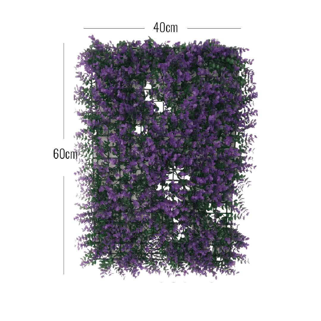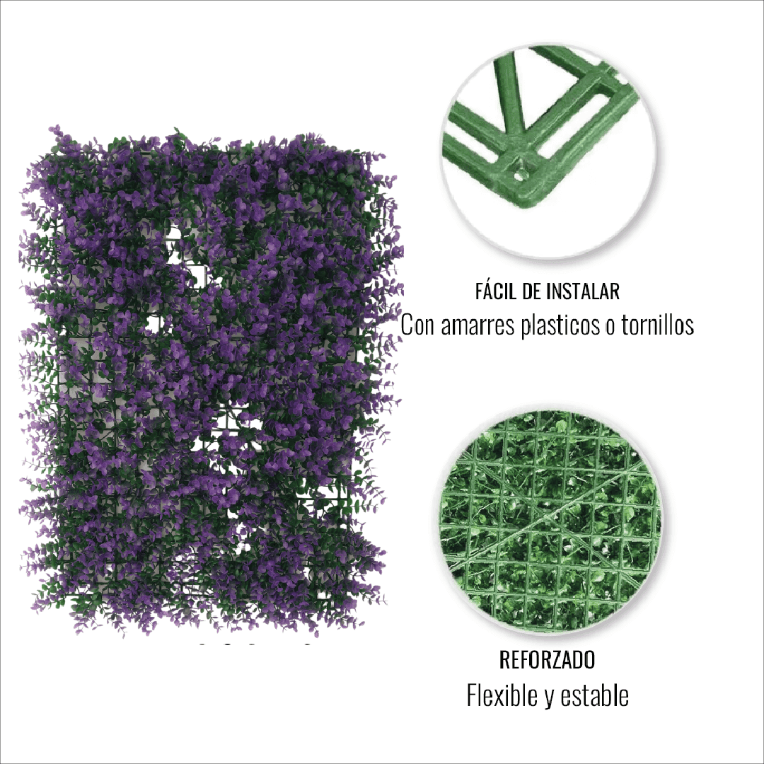 - Cobertura recomendada: 5 paneles de Follaje Artificial Verde con flores Moradas TA-4060-27 por m²