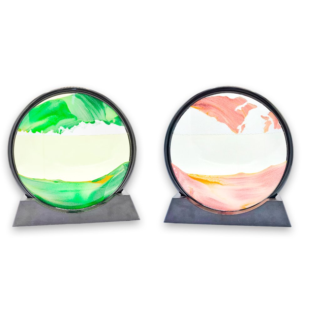 Reloj de arena giratorio que forma paisajes hipnóticos y coloridos. Ideal para oficinas, salas de estar y espacios zen.