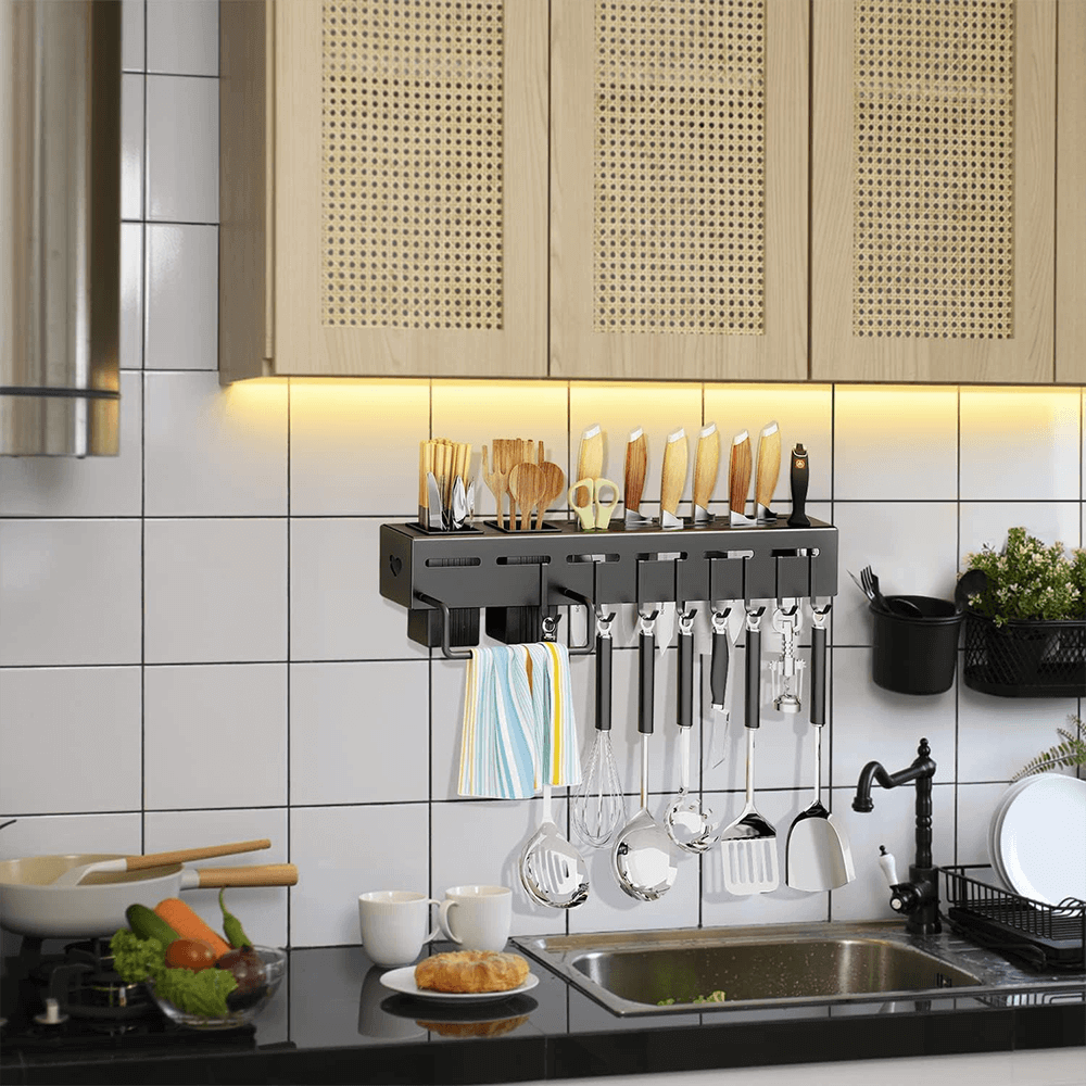 Combina porta cuchillos, ganchos y estante, lo que lo convierte en un sistema multifuncional compacto.