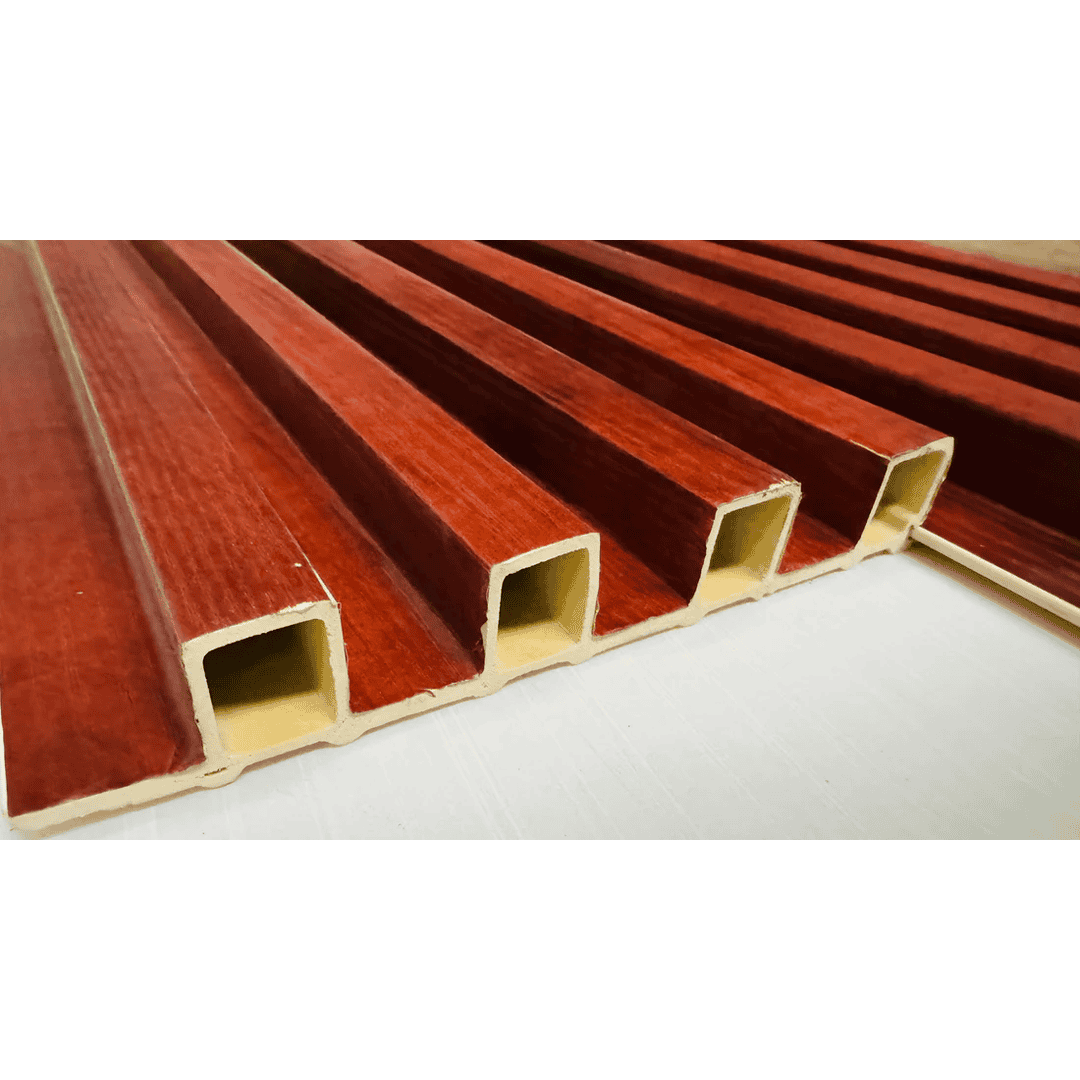 Revestimiento acanalado en cálido tono “roble cerezo”, diseñado exclusivamente para ambientes interiores que buscan estilo y durabilidad sin mantenimiento.