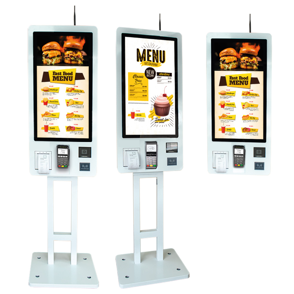 Kiosko interactivo para autoservicio con pantalla táctil, diseñado para montaje en pared o en pedestal. Ideal para toma de pedidos, pagos, turnos, check-in y consulta de catálogos en restaurantes, retail, hoteles, clínicas, universidades y entornos corporativos.