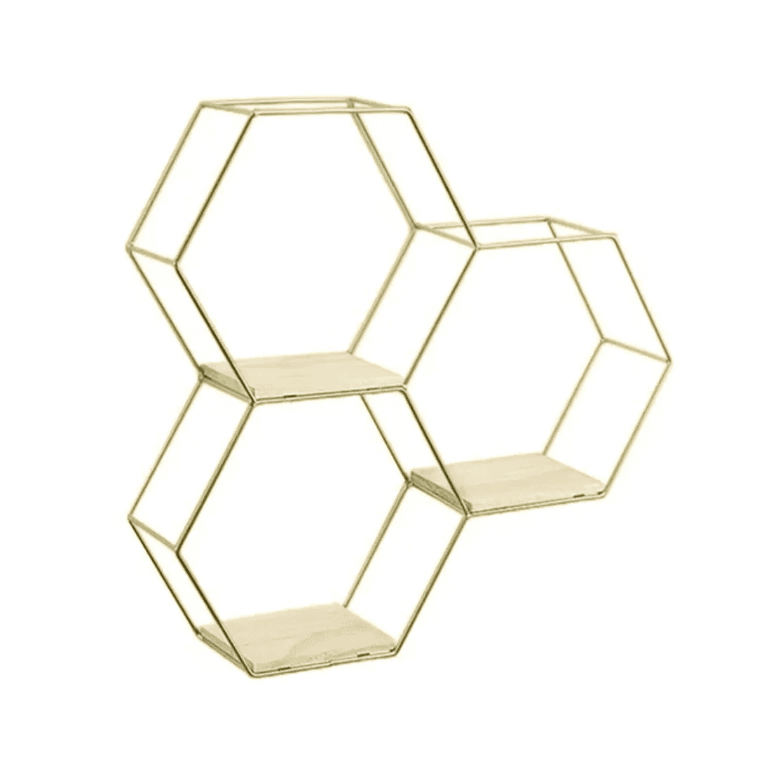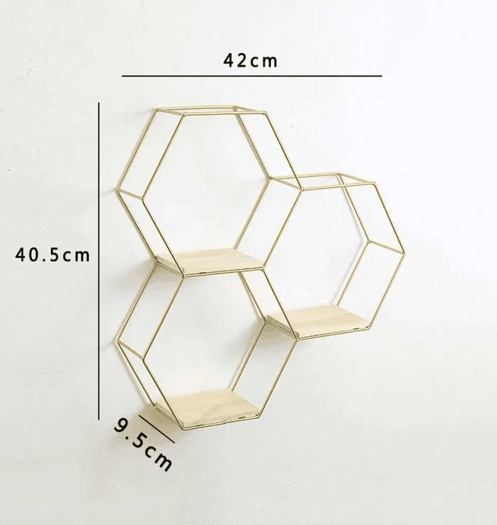 Repisa de pared con estructura geométrica tipo panal en metal color dorado y superficies en madera. Diseño moderno, elegante y liviano, ideal para destacar objetos decorativos en sala, dormitorio, estudio, oficina o locales comerciales.