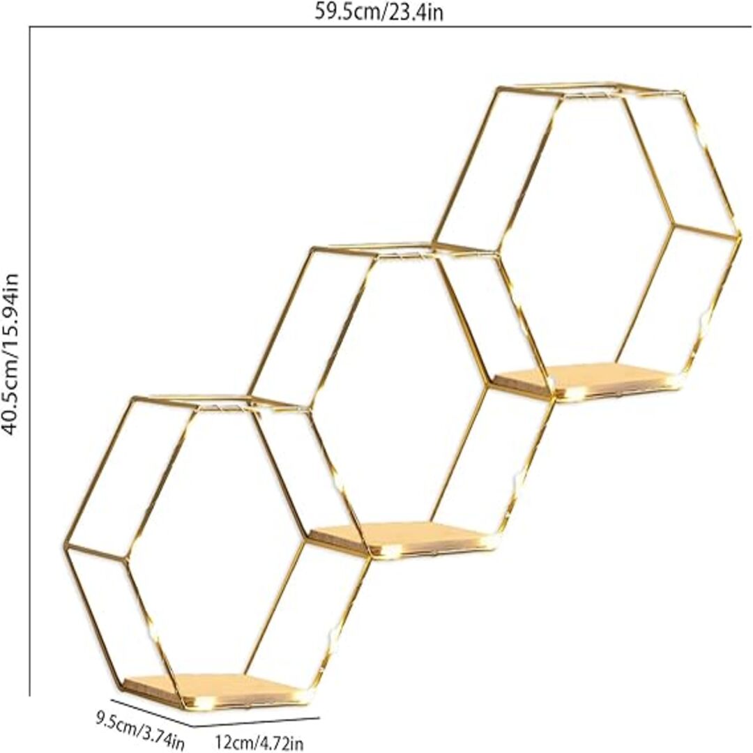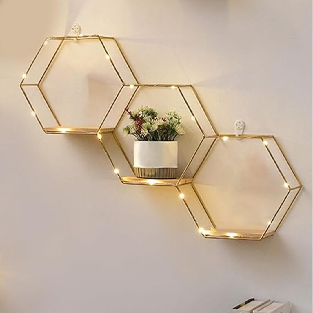Repisa flotante con diseño de panal hexagonal en acabado dorado. Moderna, elegante y funcional para decorar y organizar espacios.