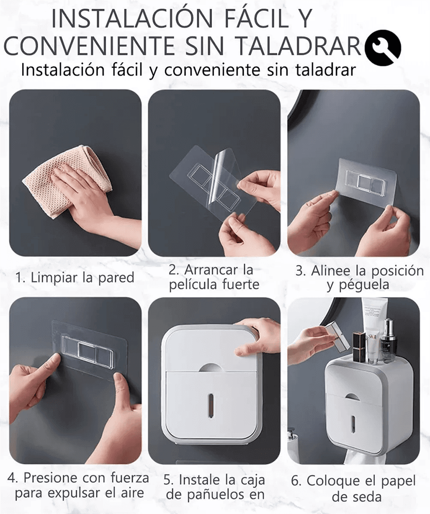 – Dispensador de rollo de papel higiénico con cubierta protectora para mantener el rollo limpio.