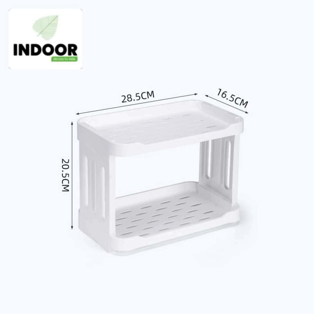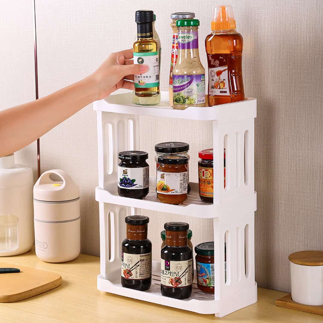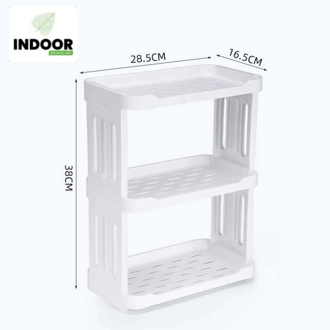 Estante compacto y resistente de tres niveles en plástico de alta durabilidad. Ideal para organizar especias, frascos, botellas pequeñas y artículos del hogar ahorrando espacio en cocina, baño, cuarto de lavado o estudio.