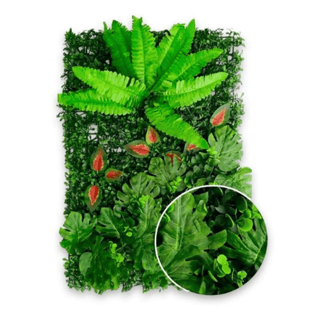 Panel 40 × 60 cm con mix de hojas helecho, filodendro y detalles rojos que recrean la abundancia de la selva.