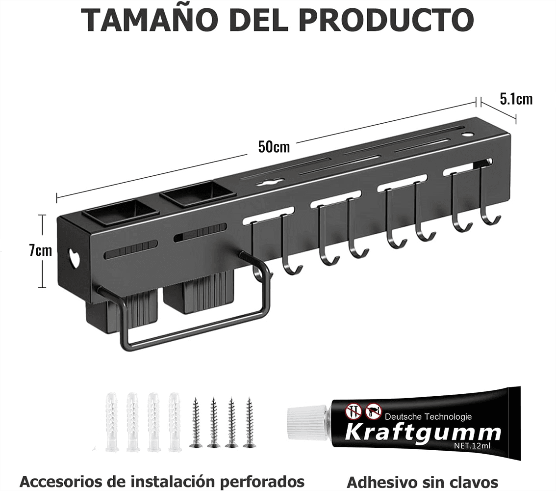 - Barra con 6–8 ganchos extraíbles para cucharones, sartenes o tazas