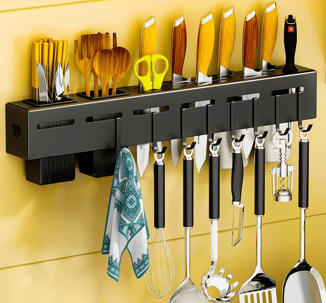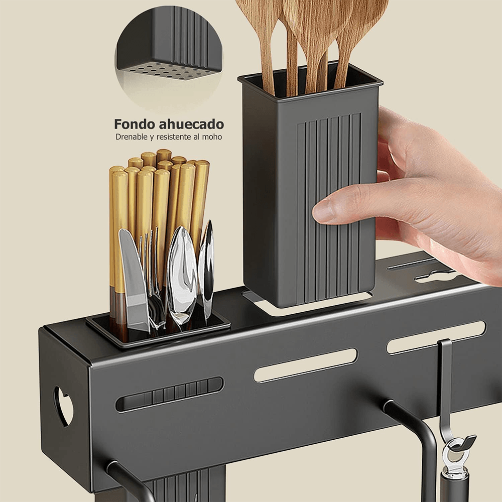 Combina porta cuchillos, ganchos y estante, lo que lo convierte en un sistema multifuncional compacto.