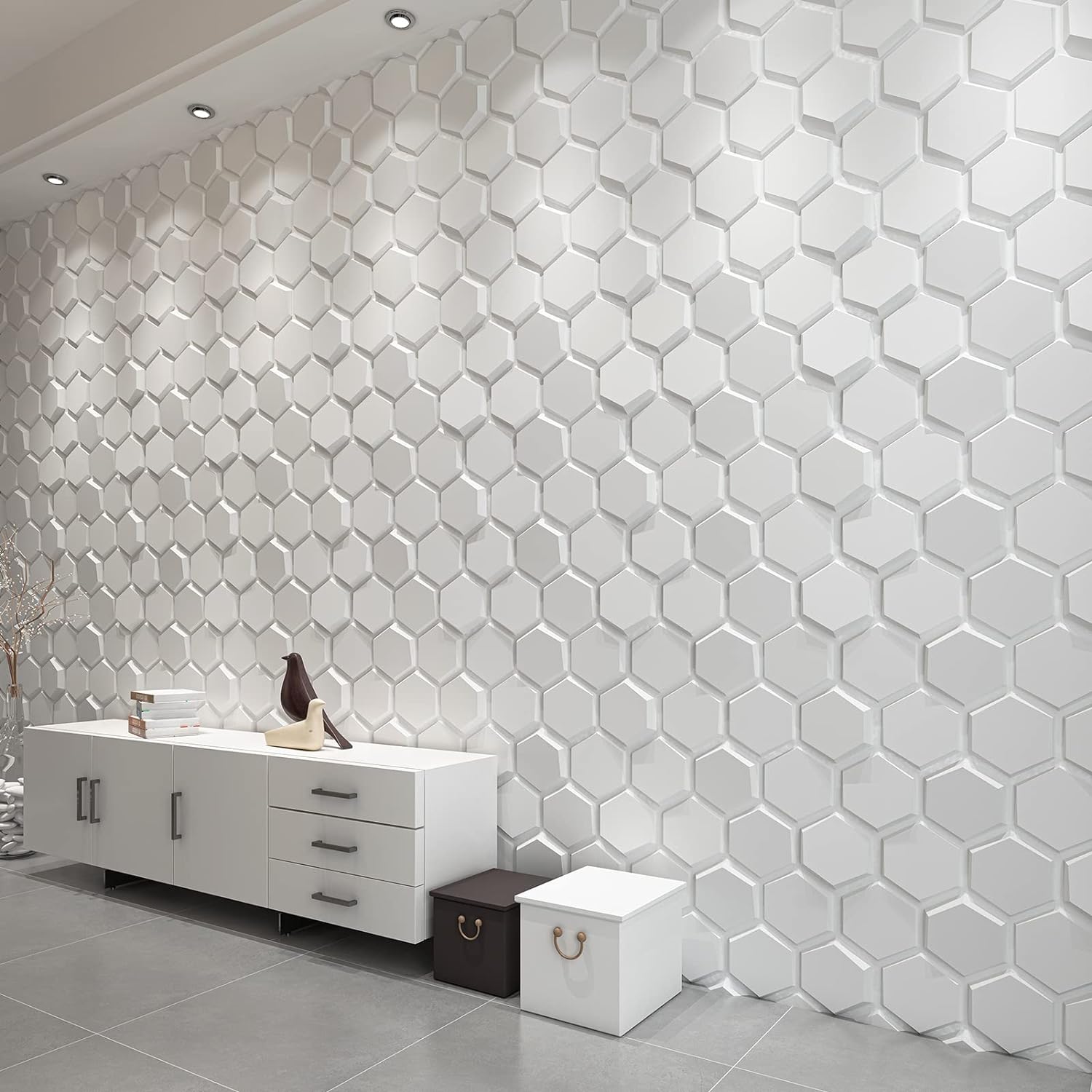 - Paredes Acentuadas: Instala los paneles 3D con hexágonos en una pared destacada de tu sala de estar, dormitorio o incluso en el pasillo para crear un acento visual único.