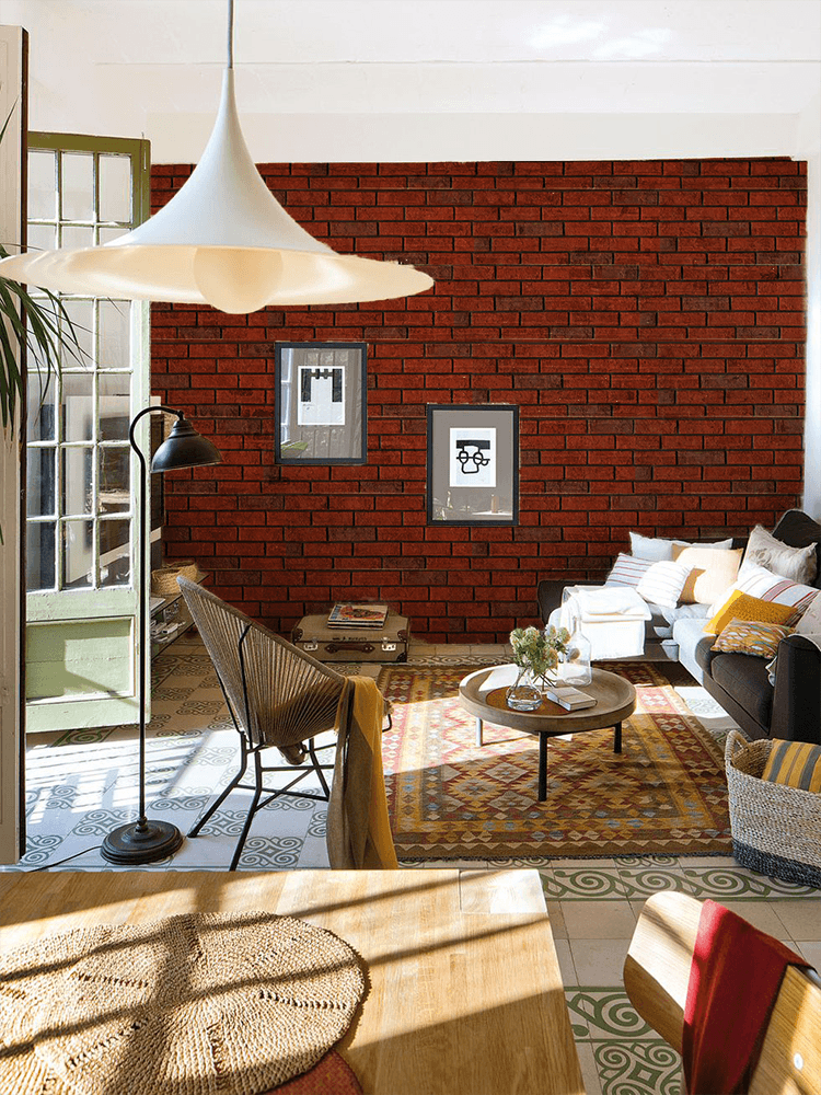 Cuenta con relieve y coloración que imitan ladrillos reales en tonos terracota y rojos oscuros, aportando profundidad visual.