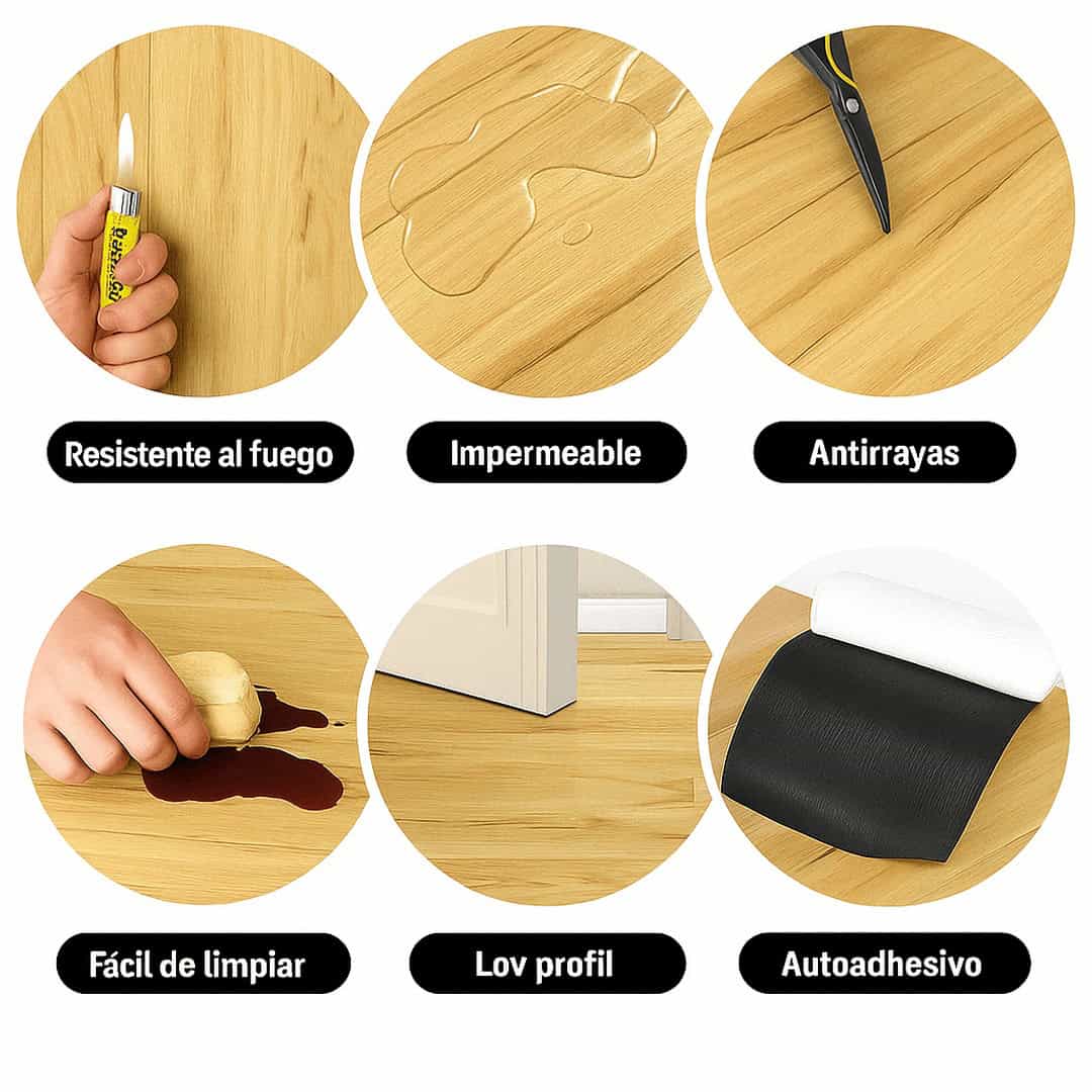 Pagas una fracción de lo que cuesta un porcelanato o una madera maciza, pero recibes un producto con: