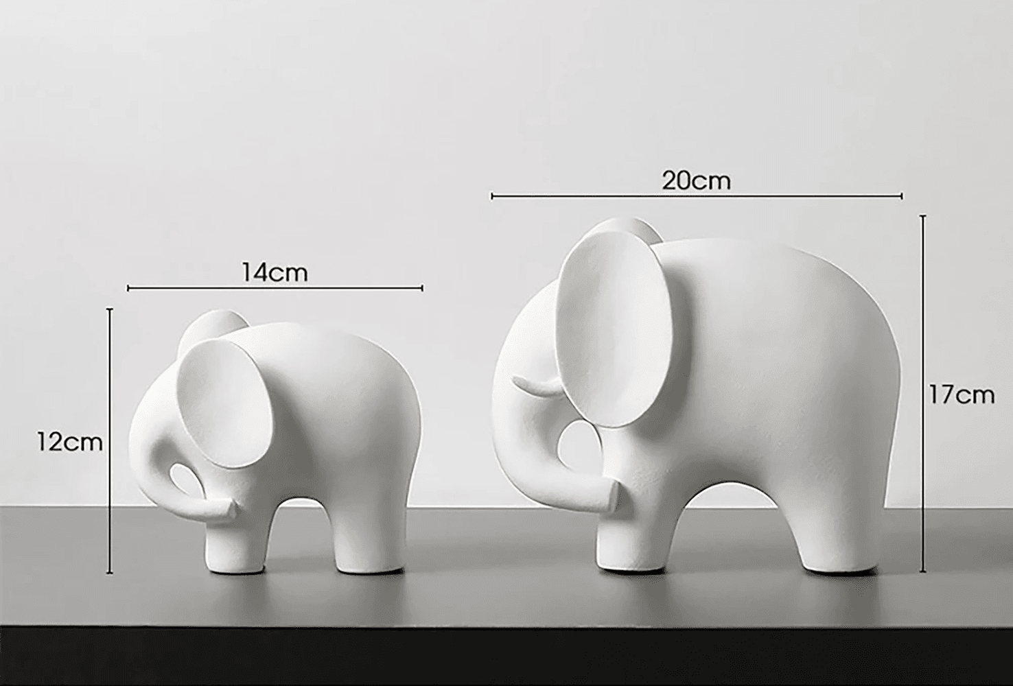 - Dimensiones: elefante grande 15 × 9 × 8 cm; elefante pequeño 12 × 7 × 6 cm.