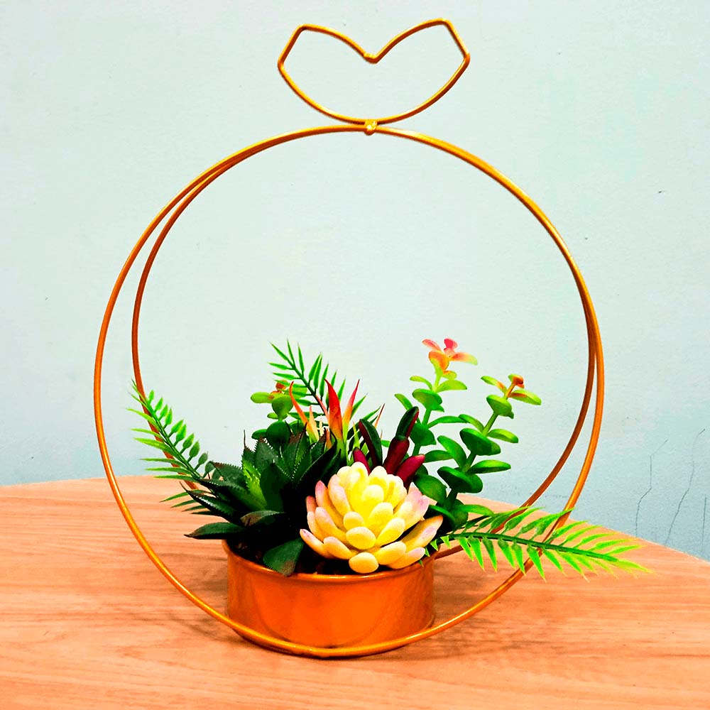 El marco metálico que la sostiene, disponible en tonos sobrios y elegantes, permite colgarla fácilmente en paredes, columnas, balcones o estructuras decorativas. Su diseño colgante da una sensación de movimiento y vida, convirtiéndola en una excelente opción para interiores con estilo moderno, rústico o natural.